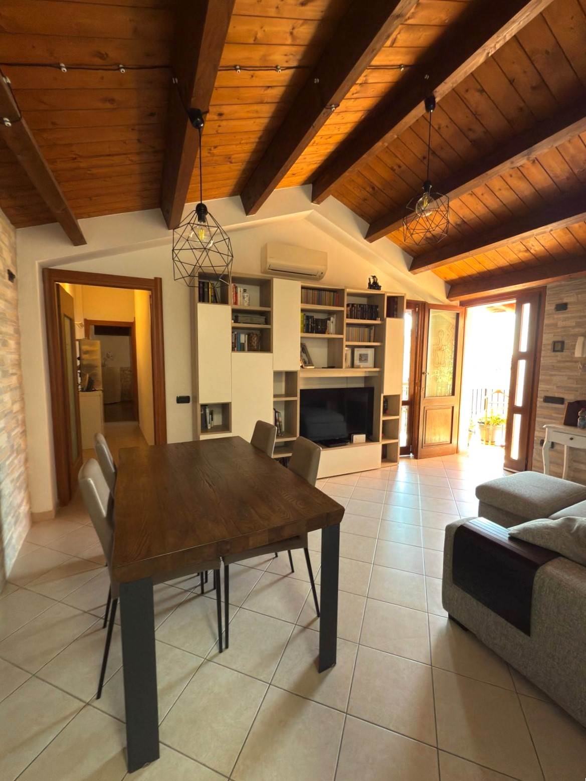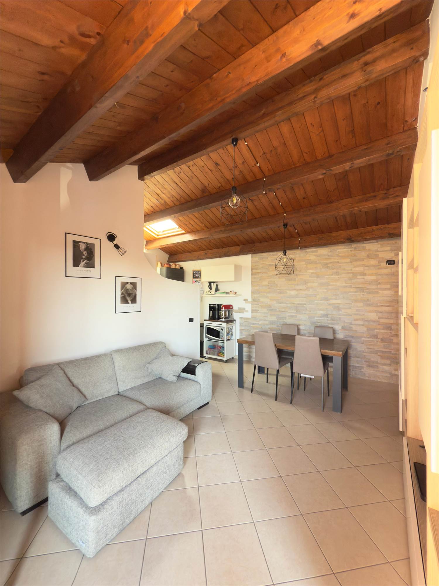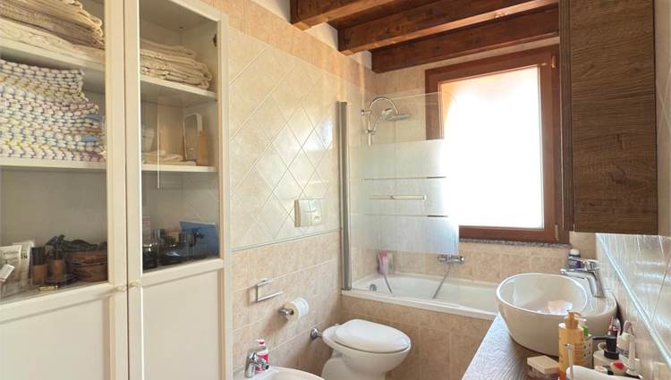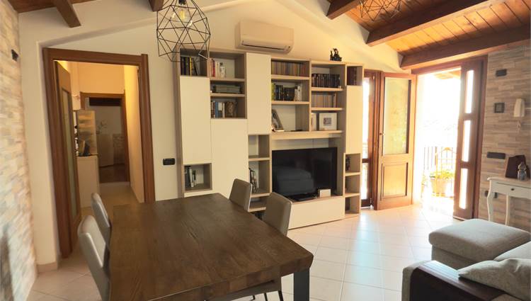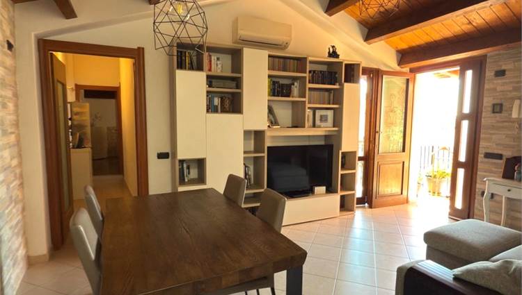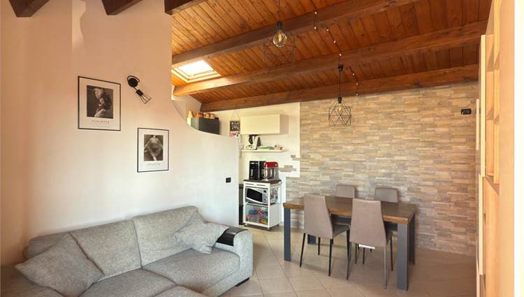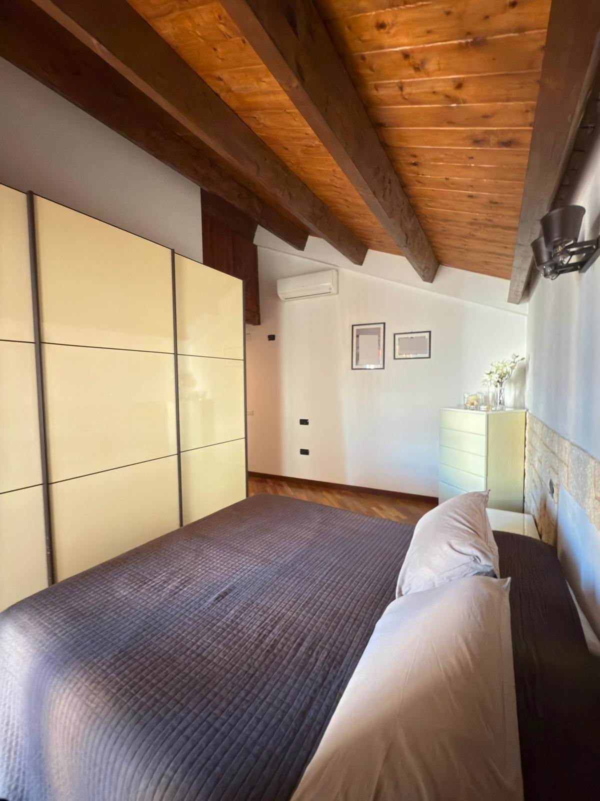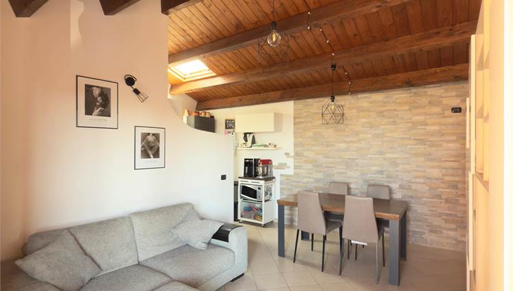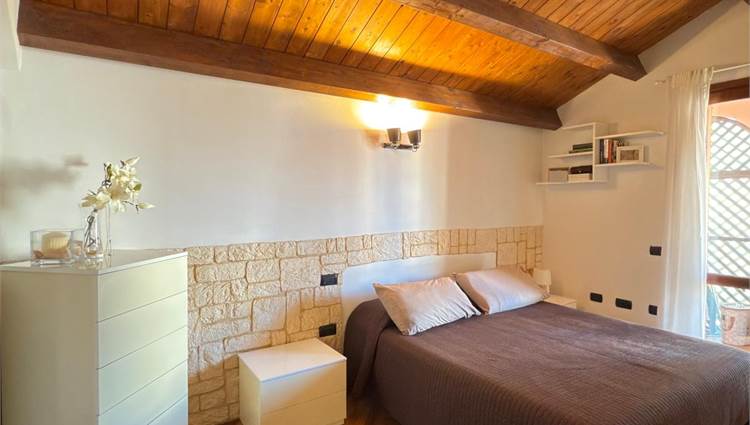 L’appartamento si distingue per il suo stile caldo e accogliente, grazie alle travi in legno a vista e alle ottime finiture.