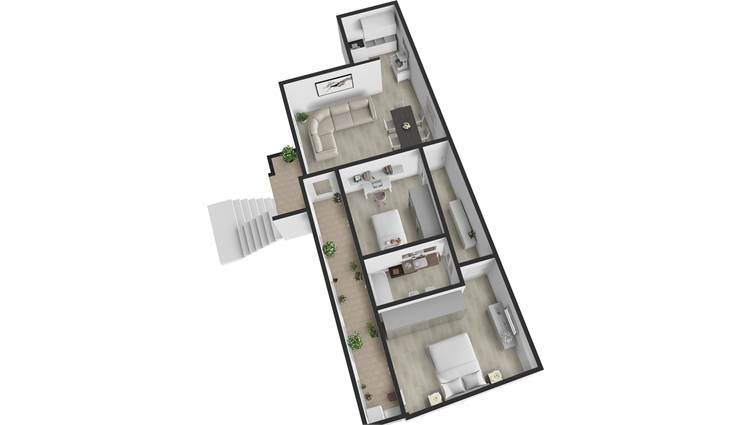 La camera matrimoniale, impreziosita dal parquet e da un elegante soppalco, trasmette un senso di calore e intimità; un secondo soppalco, nel bagno, offre ulteriore spazio prezioso.