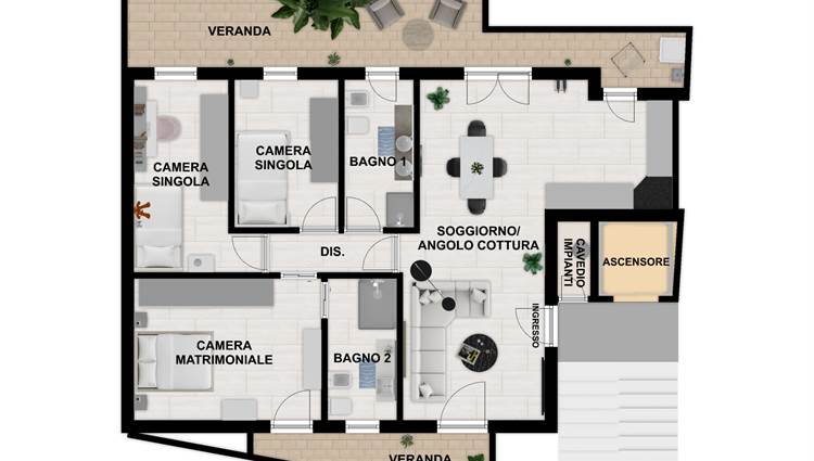 La zona giorno, ampia, luminosa e ben distribuita, accede direttamente a una terrazza vivibile, ideale per momenti di relax e convivialità.