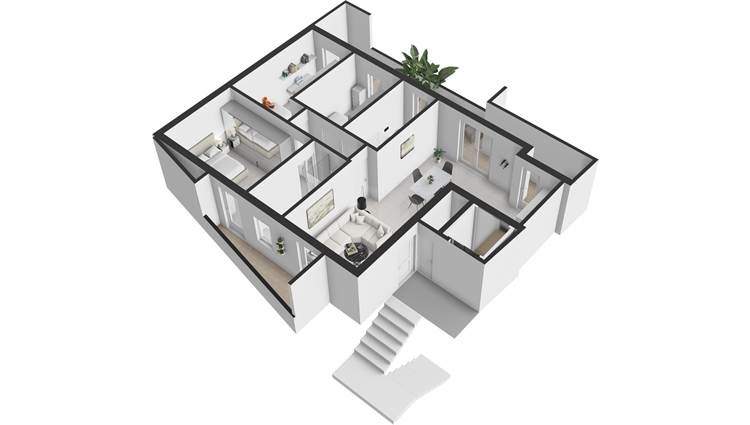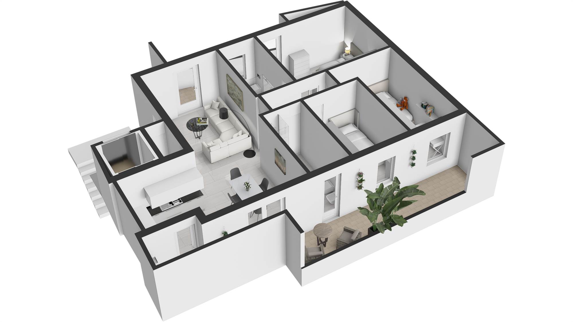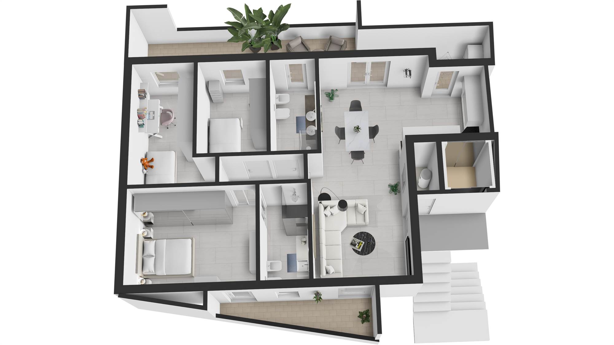 La zona giorno, ampia, luminosa e ben distribuita, accede direttamente a una terrazza vivibile, ideale per momenti di relax e convivialità.